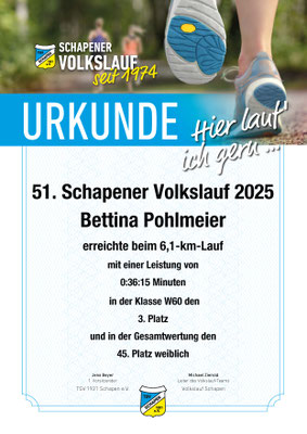 3. Platz (AK W60) Bettina Pohlmeier (36:19 Minuten)