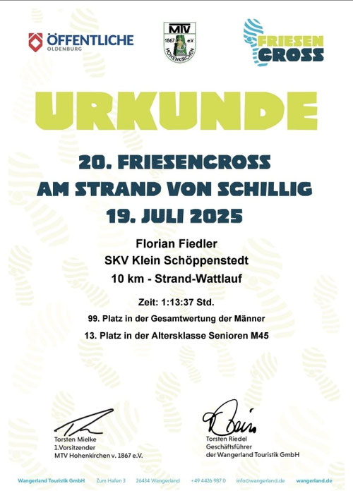 Florian Fiedler aus unserem Lauftreff hat am 19.Juli den 20. Friesencross 2025 in Schillig erfolgreich absolviert. Wir möchten Florian ganz herzlich zu dieser tollen Leistung gratulieren.